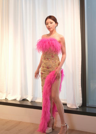 A daring statement of sparkle and feathers, the Pink Sapphire Luxe features a nude-tone base embroidered with glittering crystals and sequin florals. The strapless bodice bursts into a vibrant fuchsia feather plume, cascading down into a dramatic high-slit skirt with feather train detail. Bold, captivating, and made for the spotlight.