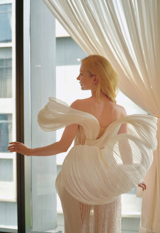 - The gown features masterfully pleated organza waves that wrap around the body, creating a breathtaking 3D sculptural effect.